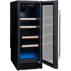 Avintage wine coolers, as with most wine coolers, have a bottle capacity measured in Bordeaux bottles. The AVU25SXMO, 300mm wine fridge, includes 4 wooden fronted shelves and 1 fixed display shelf. With a full capacity of 24 Bordeaux, 2 shelves are slightly deeper allowing for the display of 3 bottles on each shelve creating an enhanced presentation.