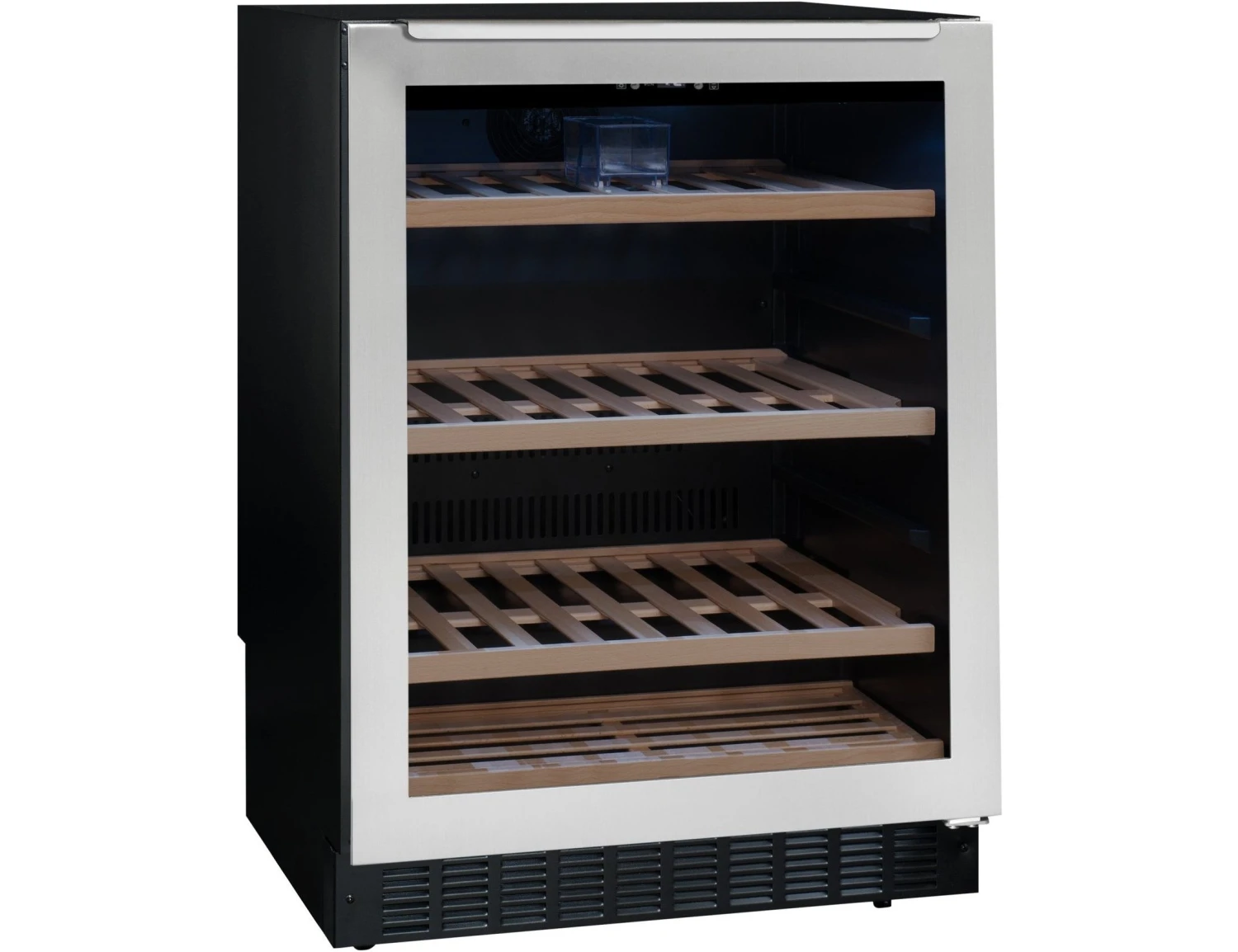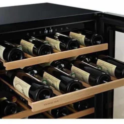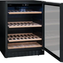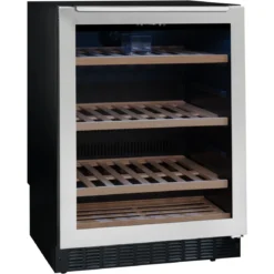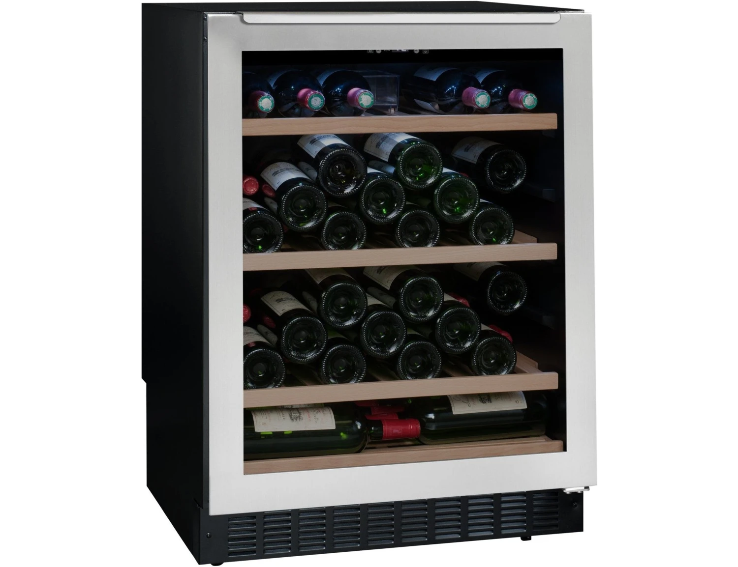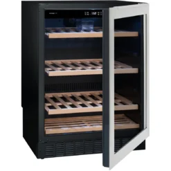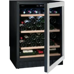 As with most wine coolers, have a bottle capacity measured in Bordeaux bottles. The AVU52TXA includes 3 shelves and ample capacity allowing for storage of up to 50 bottles when all shelves are installed. It is possible to stack bottles in two layers on each shelf and it’s recommended stacked bottles are the same shape. Larger bottles such as magnums and Burgundy bottles will also fit comfortably in the cabinet however storage of these bottle types will reduce overall capacity. It’s also possible to adjust the levels of the shelving to meet your storage requirements.
