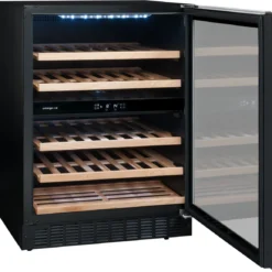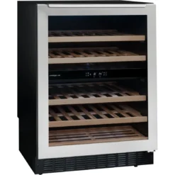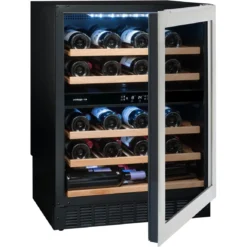 Avintage wine coolers, as with most wine fridges, have a bottle capacity measured in Bordeaux bottles. The AVU52TXA includes 5 shelves and ample capacity allowing for storage of up to 50 bottles (16 bottles in the upper zone and 34 bottles in the lower zone) when all shelves are installed. Larger bottles such as magnums and Burgundy bottles may also fit in the cabinet however storage of these bottle types will reduce overall capacity. It’s also possible to adjust the levels of the shelving to meet your storage requirements.