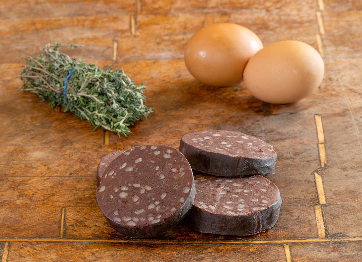 Our black pudding is made by mixing blood with oat flakes, oatmeal, pearl barley and spices and is sliced for you (the whole ‘puddings’ are quite big!). It is made the old-fashioned way with fresh rather than dried blood – for a really special flavour.Â