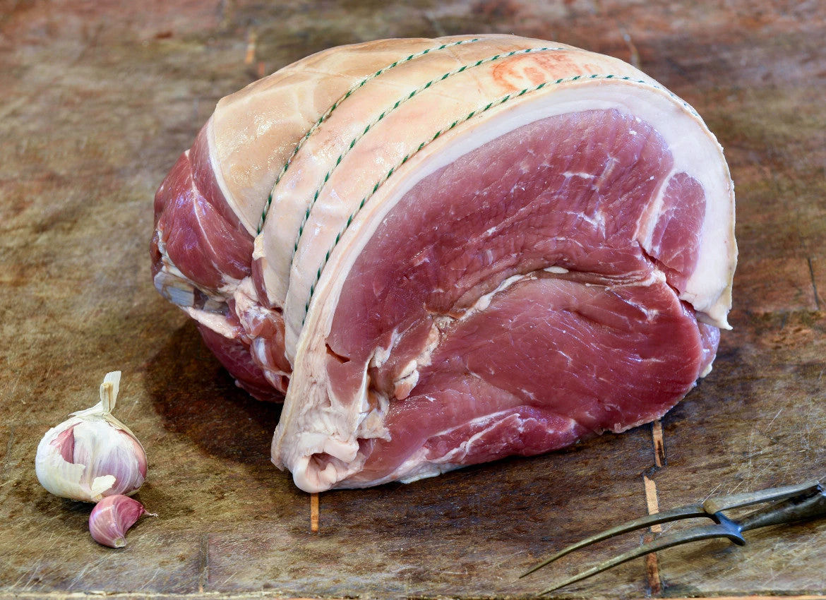 The gammon comes from the hind leg of the pig. The leg is then cured in the same way as bacon.