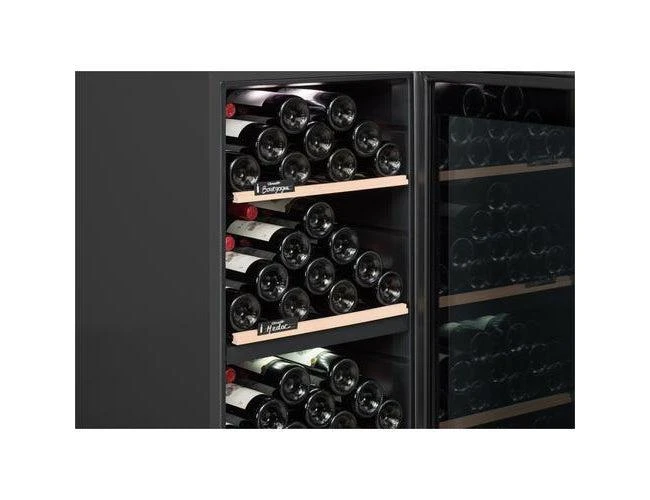 There is capacity for 56 Bordeaux bottles in this wine cooler, with space for 47 bottles in the top zone and 56 bottles in the lower zone . Your wines will be beautifully illuminated by the internal white LED light. The shelving in this wine cooler is double layered on a number of shelves and there are 4 metal shelves with wooden fronts included.