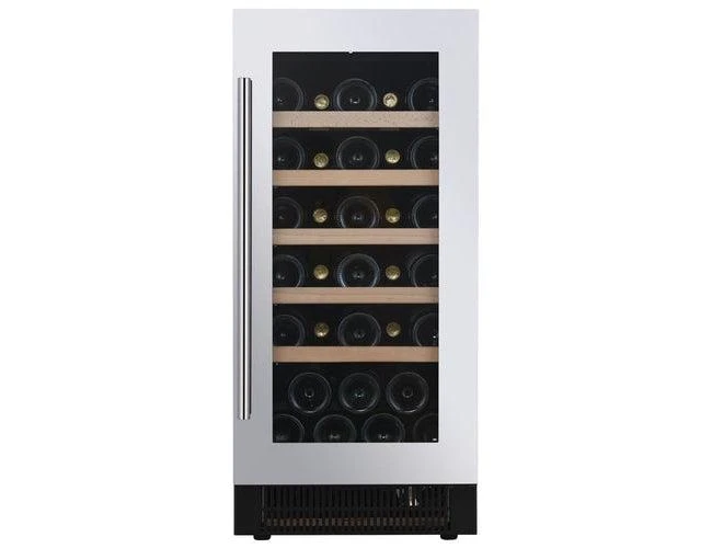 The DAUF-32.83SS wine cooler is suitable for use as a built in wine or under counter wine cooler. The wine fridge features front ventilation and can be installed into cabinetry as air is pulled in from the front vent to cool the compressor and ensure the unit does not overheat. The unit is designed to be installed within a cavity of 40cm / 400mm width. The appliance is lit with a beautiful blue LED light and is fitted with stunning black door providing a seamless look.