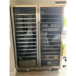 – 194 Bottle Capacity with two shelves removed, 180 with all shelves mounted (750ml standard Bordeaux bottles)Â – Larger bottles will reduce the capacity