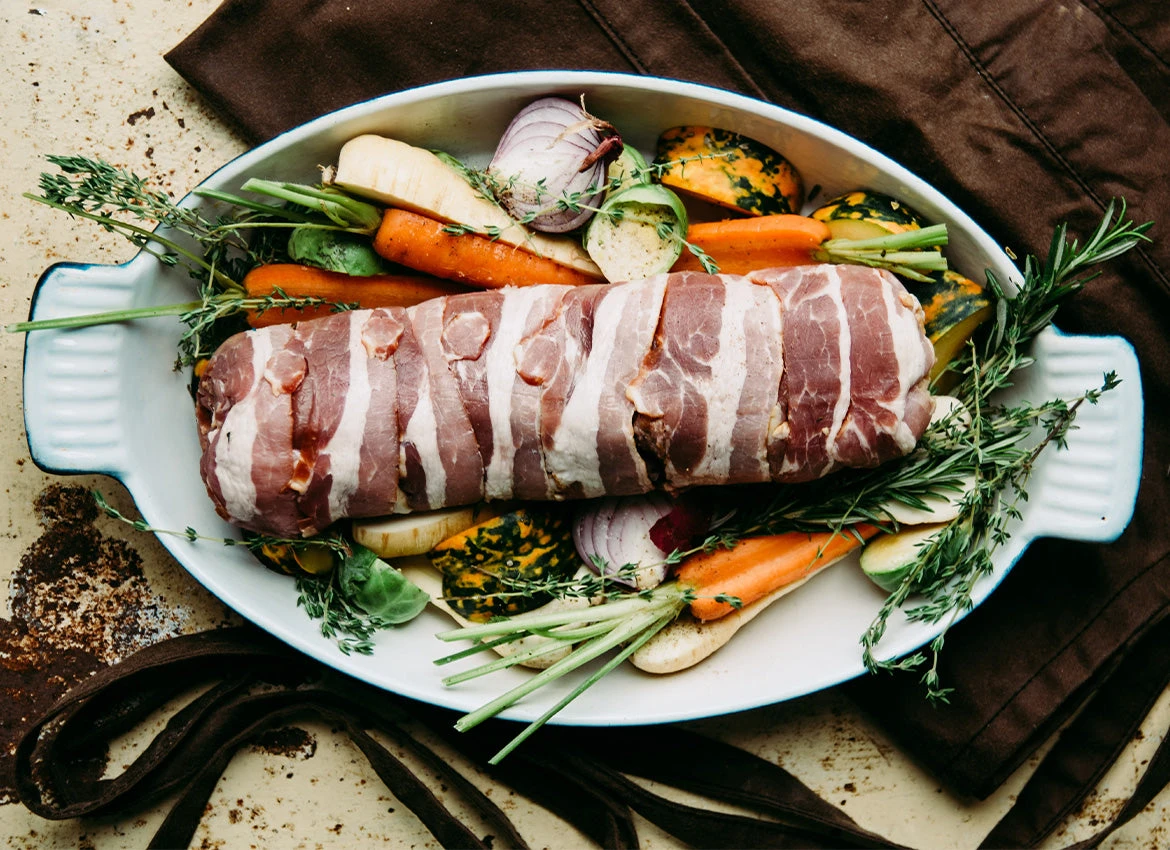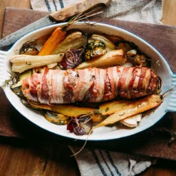 We created the idea of a game roulade when we first started the business and it has introduced thousands of people to the delights of eating game. With no bones or waste, the roulade is great roasted in the oven and eaten either hot or cold. As a starter its hard to beat cold, finely sliced with some relish and garnish. The dark meat from the wood pigeon and the lighter meat from the pheasant fillets making a lovely contrast on the plate. The stuffing in the center of the roulade is a wild boar sausage meat gluten free stuffing with is wrapped in smoked streaky bacon