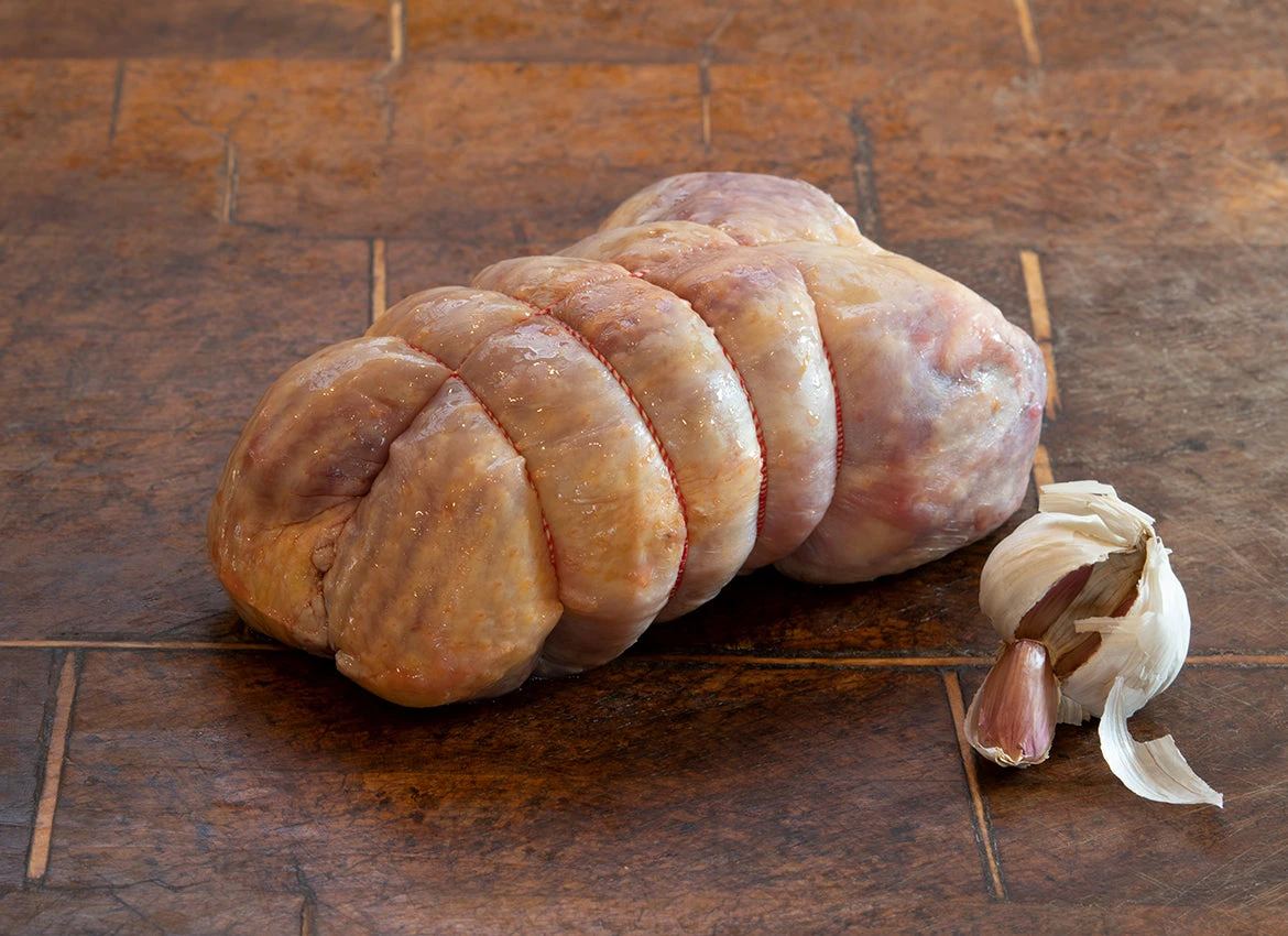 The dark meat of the wild duck in the middle of this roast is complemented by the white meat of the boned guinea fowl on the outside. In between the two boned birds is a layer of wild boar forced meat stuffing which keeps the whole thing moist.