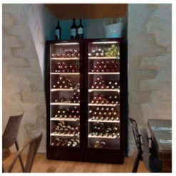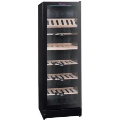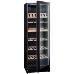 The wine cooler has a stainless steel door with anti UV glass, anti-vibration system and four retractable shelves. The wine cooler holds up to 195 bottles.