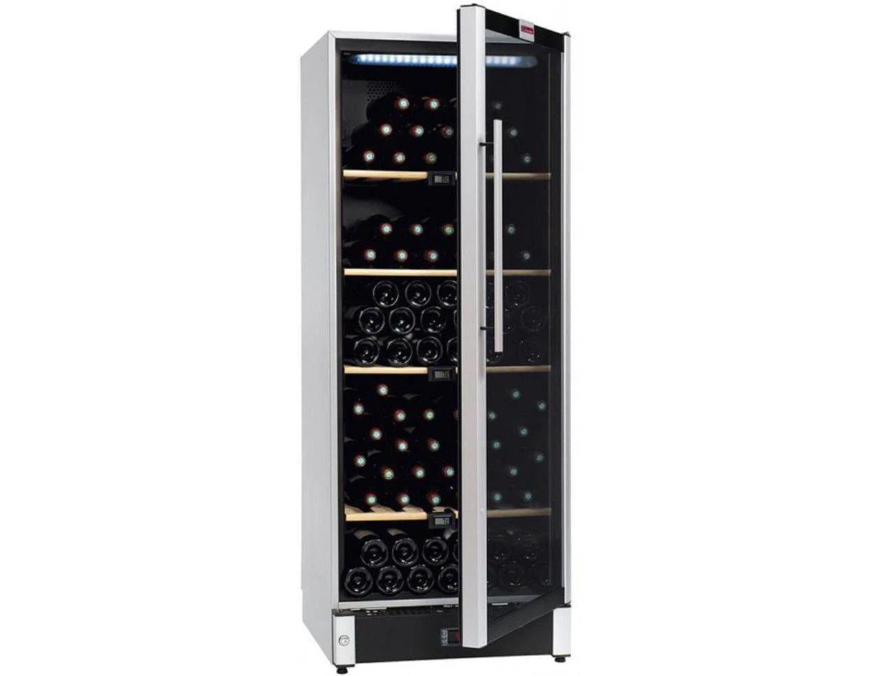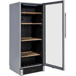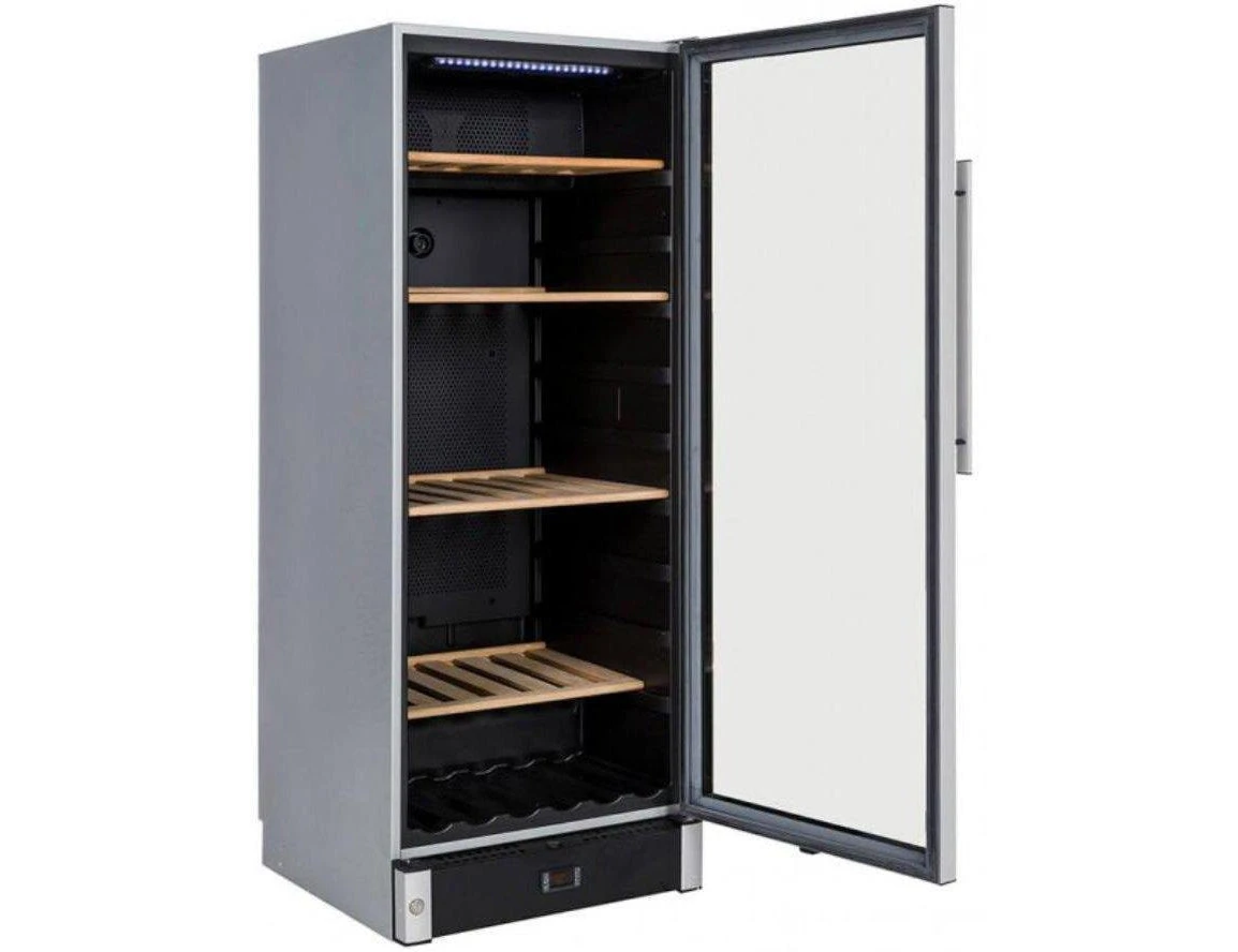 The wine cooler has a stainless steel door with anti UV glass, anti-vibration system and four retractable shelves. The wine cooler holds up to 160 bottles.