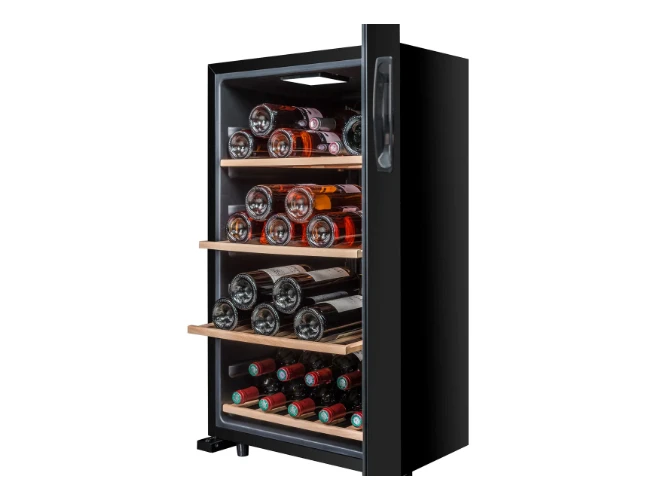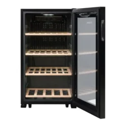 As with most wine coolers, have a bottle capacity measured in Bordeaux bottles. The LS52BLACK has a capacity of up to 52 bottles (75ml Bordeaux bottles) and includes 3 semi sliding wooden shelves with and 1 half beech shelf.