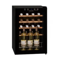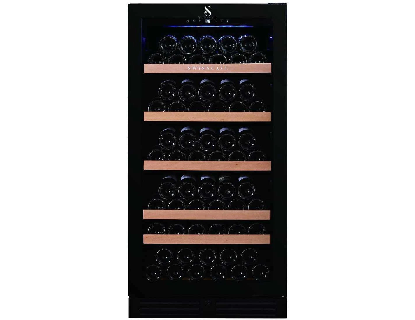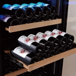 Swisscave wine coolers, as with most wine coolers, have a bottle capacity measured in Bordeaux bottles. The WL355F includes 5 shelves and ample capacity allowing for storage of up to 112 bottles when all shelves are installed. It is possible to stack bottles in two layers on each shelf and it’s recommended stacked bottles are the same shape. Larger bottles such as magnums and Burgundy bottles will also fit comfortably in the cabinet however storage of these bottle types will reduce overall capacity. Â