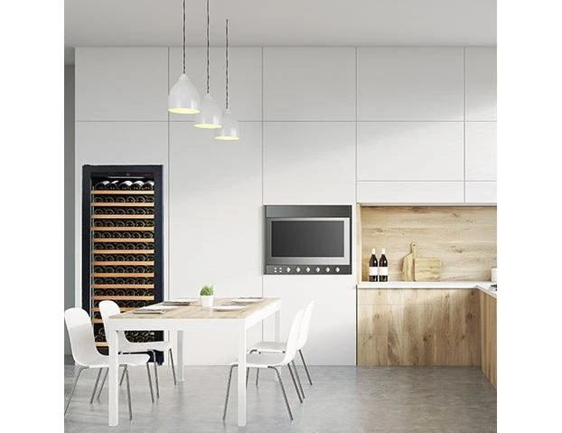 With a maximum capacity of 146 Bordeaux bottles. Each layer of bottles is supported on individual shelves, rather than stacked, for easy access to the wines. The unit also has a display shelf at the top that can be rearranged or additional shelves added at a later date. The temperature within the unit can be adjusted between 5-22°C, and it has a heating system to allow it to function in ambient temperatures as low as 0°C.